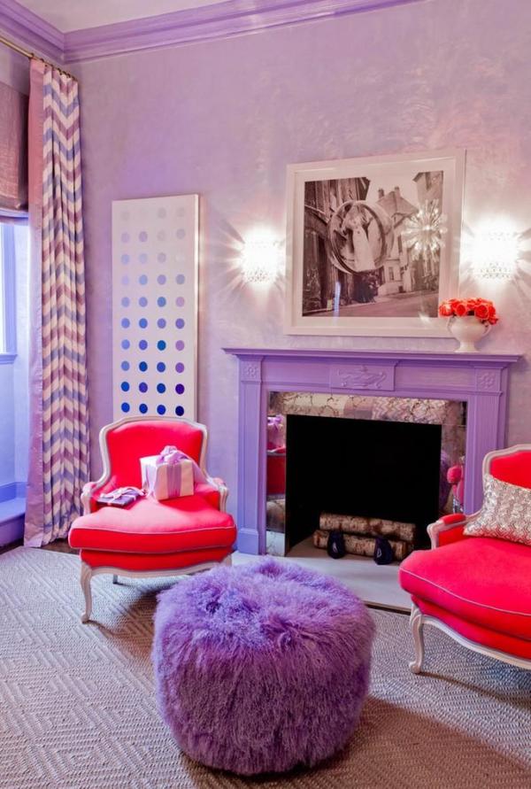 7.大膽而時(shí)髦的搭配,適合熱情的女生,在溫馨的紫色之中加入一些紅色的沙發(fā)和裝飾,十分迷人。