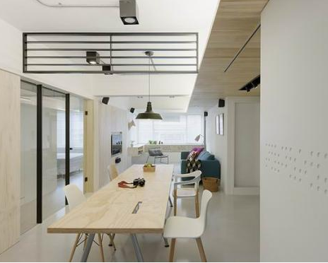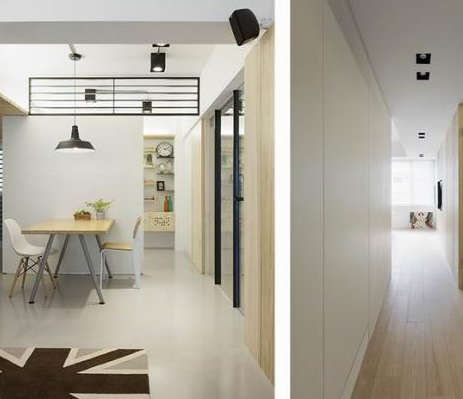 走廊和餐廳只一墻之隔,更為明快的線條組合,讓人仿佛能觸摸到射進內室的陽光,自然又和諧,而大面積白色使用,讓整個內室明朗干凈,松木合板的使用更讓整個內室更為古樸雅致。脫卻了黑白使用營造出的強烈視覺感覺,而只使用中間色進行色彩的過渡,讓整個空間色調的處理更為自然和諧。