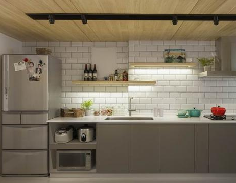 白色馬賽克墻磚所組成的磚墻紋理,干凈大方,再搭配上松木合板吊頂的使用,簡約時尚。