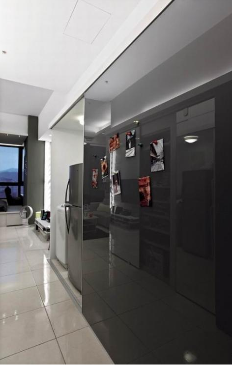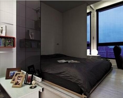 可移動可改變的折疊床,不僅大大的節省了空間,也為內飾空間的交叉設計提供一點素材,簡單明了的黑色,深邃高雅,再搭配整個內室的顏色,瞬時添了凝滯穩重。隱蔽又不突兀的收納空間,不僅解決了內室狹小的問題,又突出了空間層次的多樣化,簡約卻不簡單,豐富又不冗雜。