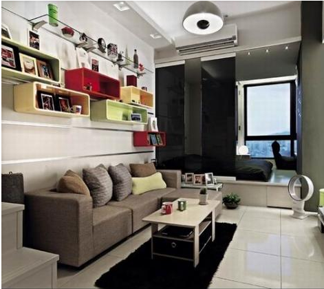 顏色各異的烤漆造型架,不僅可以發揮其強大的收納功能,小照片,鑰匙扣,卡風的紅酒,都可以收納其中,而亮麗的顏色,更為舒適性的擺設,都為內室增添一絲溫馨,一絲浪漫和滿滿的懷舊。結合采光極為強大的窗戶,打造出絕妙精巧的飄窗,厚重的絨布窗簾,可以隔開客廳成為一個獨立的會客空間亦是獨立的安謐時刻,沒了塵世的喧囂所染上的孤獨寂寞,輕捻起書頁,又添上一塊香餅,增一點禪念,減一分凡塵。