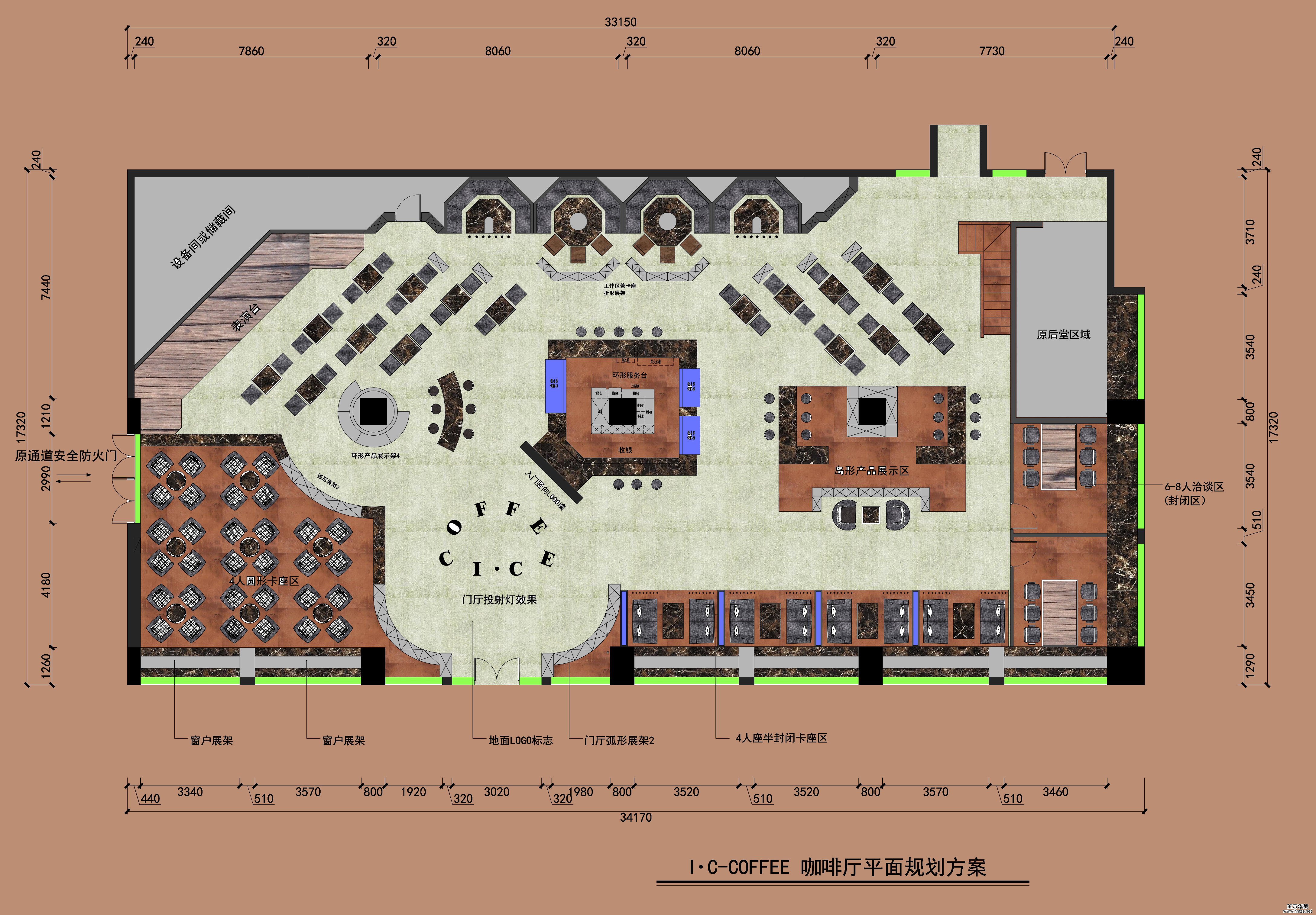 ▄設(shè)計(jì)風(fēng)格定位: 針對當(dāng)下咖啡廳特色、特點(diǎn)、結(jié)合IC咖啡的品牌、形象、服務(wù)、理念,由此裝飾設(shè)計(jì)的訴求點(diǎn)在未來5-15年的經(jīng)營過程中完勝于周圍已存在的類似性經(jīng)營場所。因項(xiàng)目處于建筑物一層,市政綠化帶以內(nèi)無視線阻擋,視線開闊,門頭設(shè)計(jì)可反向于原建筑幕墻體增加咖啡廳的特點(diǎn),又不失檔次,夜幕下利用櫥窗展示體現(xiàn)出亮化效果。 此案例的主要風(fēng)格是復(fù)古工業(yè)風(fēng),空間布局上以環(huán)形動線為主,分為入場主動線、入各功能區(qū)輔助線、展示區(qū)觀賞停頓動線,環(huán)型服務(wù)臺可服務(wù)四周。以經(jīng)營者的思路易進(jìn)不易出的動線設(shè)計(jì),橫向流動,豎向45度向內(nèi)引導(dǎo)“八”字形設(shè)計(jì),聚焦于前位島式展臺、中位環(huán)形服務(wù)臺、內(nèi)位表演區(qū)及藝術(shù)長廊式展架,第一個點(diǎn)都留有讓消費(fèi)者駐足的理由。 在空間構(gòu)成上,呈現(xiàn)出最佳設(shè)計(jì)效果,材料的合理運(yùn)用體現(xiàn)了裝飾的最佳立體質(zhì)感,局部采用金屬色、銹紅色以及深色,為了更好的體現(xiàn)整個咖啡廳的氛圍,立面材料運(yùn)用多元而不繁雜,燈光和家具的選用也是重中之重。